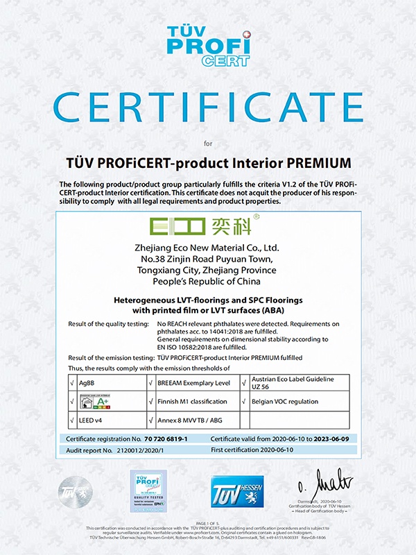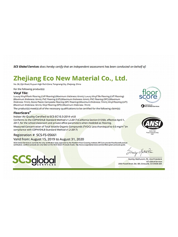 Zhejiang ECO New Material Co., Ltd. is located in Puyuan Town, a famous woolen sweater town in China, with a superior geographical position of the triangle area of Shanghai, Hangzhou and Suzhou. It was established in 2017 with a registered capital of 118.8 million Yuan. The company focuses on the research and development, production and sales of environment-friendly SPC/ESPC/MSPC/LVT/WPC floorings. It has already got more than 40 utility model patents and invention patents. The products have also passed the testing from National Standard, American Standard and European Standard, got all the necessary professional certifications.